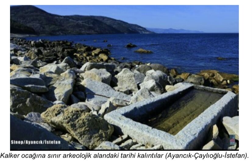 Sinop’un Ayancık ilçesi sahilinde açılan kalker ocağı, arkeolojik sit alanıyla iç içe bir alanda yer alıyor. Başlangıçta kıyı dolgusunda kullanılmak üzere Rusya’ya ‘taş satmak’ amacıyla Çaylıoğlu köyünde açıldığı belirtilen taş ocağının mevzuata aykırı şekilde çalıştığını belirten Dr. Eşref Atabey, “Çaylıoğlu kalker ocağı, 2872 Sayılı Çevre Kanunu, 2863 Sayılı Kültür ve Tabiat Varlıklarını Koruma Kanunu; sit alanları, 3621 sayılı Kıyı Kanunu; 1380 sayılı Su Ürünleri Kanunu ilgili hükümlerine aykırı olup, deniz kıyısı ve İstefan sit alanında oluşu nedeniyle faaliyetine son verilmelidir” dedi. Sinop’un Ayancık ilçesine bağlı Çaylıoğlu köyü sahilinde, denize sıfır mevkii de açılan kalker ocağı ve kırma eleme tesisinin mevzuata aykırı şekilde faaliyet yürüttüğü öne sürüldü.