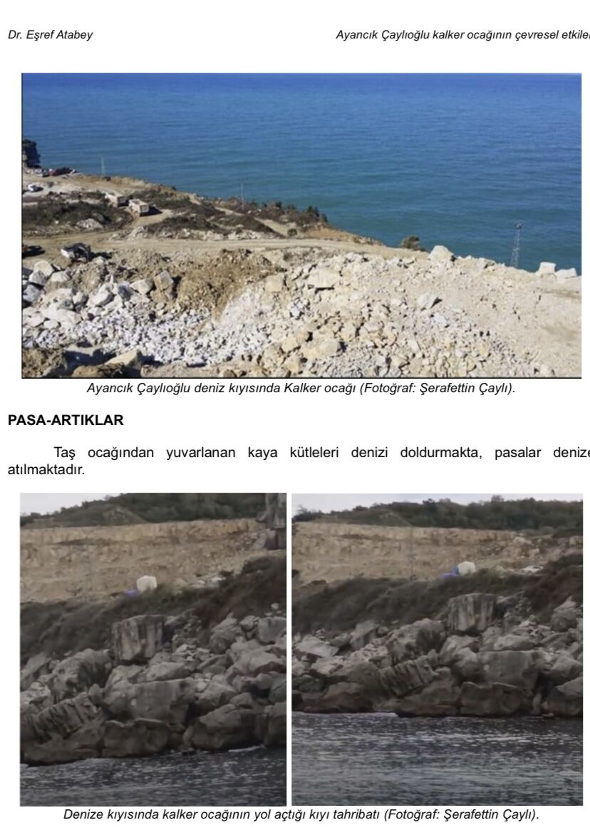 Jeoloji Yüksek Mühendisi-Tıbbi Jeoloji Uzmanı Dr. Eşref Atabey, “Ayancık Çaylıoğlu kalker ocağının çevresel etkileri” başlığını taşıyan kapsamlı bir rapor hazırladı. Özel bir şirket tarafından işletilen taş ocağının, deniz kıyısında ve İstefan arkeolojik sit alanında bulunduğuna işaret eden Atabey, “Proje konusu faaliyetin kapasitesi 504.000 ton (201.600 m3), ÇED alanı 13,08 hektar belirlenerek, 30.11.2012 tarihinde ‘’ÇED olumlu’’ kararı verilmiştir” bilgisini aktardı.