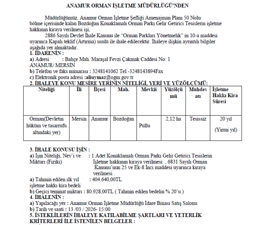 Mersin’in Anamur ilçesinde Bozdoğan sahilinde yer alan 20 bin m2’den büyük orman arazisi Konaklamalı Orman Parkı olarak 20 yıllığına ihaleye çıkarılıyor. Toplam 650 m2’den fazla yapılaşma içeren proje kapsamında restoran, büfe, bekçi ve personel binaları ile sıhhi tesis, idari bina, ibadethane, yöresel ürün satış üniteleri inşa edilecek. Çadır ve karavan kamp alanlarını da içeren Bozdoğan Konaklamalı Orman Parkı’na giriş ise ücretli olacak. İlk yıl için 404 bin 640 TL kira bedeli belirlenen orman parkı ihalesi 13 Mart 2026 tarihinde Anamur Orman İşletme Müdürlüğü’nde yapılacak.