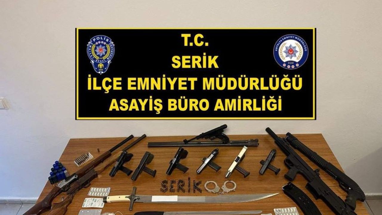 Gerçekleştirilen operasyonda yapılan aramalarda, 2 adet ruhsatsız pompalı tüfek, 2 adet ruhsatsız av tüfeği, 7 adet ruhsatsız tabanca, 172 adet fişek ve 35 adet dolu kartuş, 23,8 gram esrar, 16 parça halinde 340 kullanımlık A4 uyuşturucu maddesi, 50 adet Suboxone, 24 adet Lyrica ve 1 adet Gerica hap, 1 adet kılıç, 5 adet Rambo bıçağı, 1 adet av tüfeği namlusu ve 1 adet kelepçe ele geçirildi. Polis ekipleri, toplam 17 adreste yürüttükleri operasyon sonucunda 16 şüpheli şahsı yakaladı. Olayla ilgili soruşturma Serik Cumhuriyet Başsavcılığı koordinesinde sürdürülüyor.