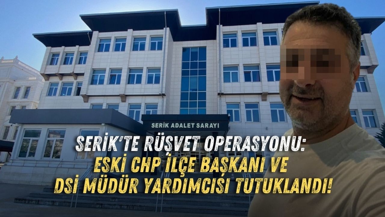 Antalya'nın Serik ilçesinde gündeme damga vuran rüşvet soruşturmasında eski CHP Serik İlçe Başkanı Y.E. ve DSİ 13. Bölge Müdür Yardımcısı T.A., işlerini kolaylaştırma karşılığında para talep ettikleri iddiasıyla adliyeye sevk edildi. Jandarma tarafından suçüstü yakalanan şüphelilerden Y.E. ve T.A., mahkeme tarafından tutuklanırken, soruşturmayla bağlantılı Serik DSİ işletme ve bakım mühendisi A.A.A., adli kontrol şartıyla serbest bırakıldı.