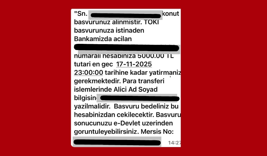 TOKİ'nin 10 Kasım'da başlattığı 500 bin sosyal konut projesine online olarak başvuran vatandaşlar, başvuru sonrası kendilerine tanımlanan İBAN'a başvuru bedelini yatırmak üzere SMS ile bilgilendiriliyor. Bir başvuru sahibi, resmi kanal aracılığıyla gelen ve açıkça hatalı hazırlanmış sahte mesajların birbirine çok benzediğini ancak dili ve içerik hatalarından ötürü aldatmacanın kolaylıkla anlaşıldığını belirtti.