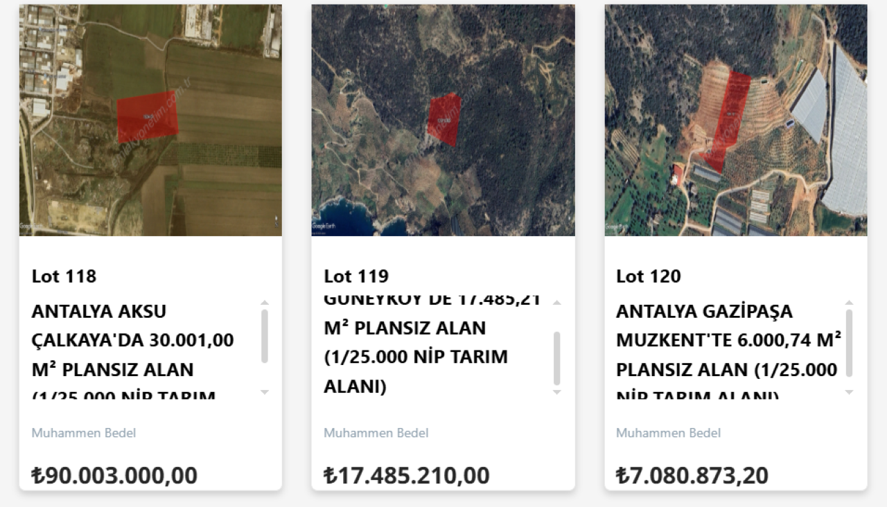 Antalya listesindeki en yüksek bedelli taşınmaz, Lot No: 118 olarak duyurulan Aksu Çalkaya Mahallesi’ndeki parsel oldu. 1534 ada 3 parselde bulunan taşınmazın büyüklüğü 30 bin 1 metrekare olarak açıklanırken, muhammen bedeli 90 milyon 3 bin TL olarak belirlendi. Teminat tutarı ise 5 milyon TL.