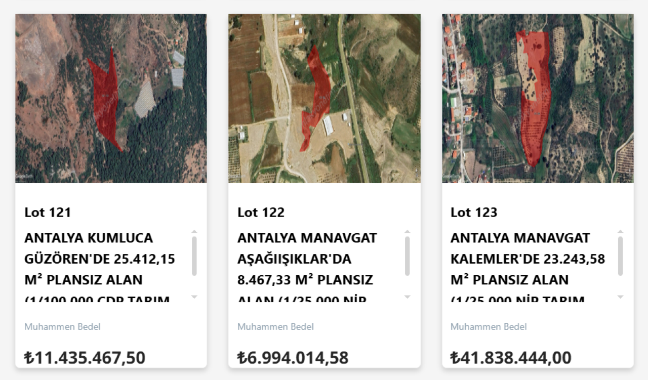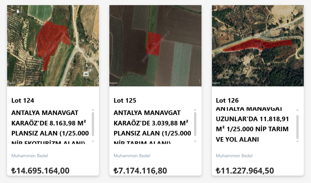 Manavgat’taki bir diğer taşınmaz Lot No: 124 olarak listelenen Karaöz Mahallesi’ndeki parsel oldu. 124 ada 41 parselde bulunan bu taşınmazın büyüklüğü 8 bin 163,98 metrekare, muhammen bedeli ise 14 milyon 695 bin 164 TL. Teminat tutarı 2 milyon TL.