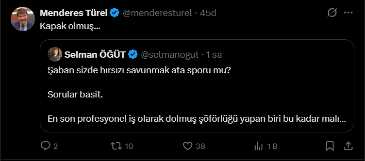 Kavganın final hamlesi ise yine Menderes Mehmet Tevfik Türel'den geldi. Menderes Türel, Selman Öğüt'ün Şaban Sevinç'e yönelik ağır ifadeler içeren mesajını kendi hesabından paylaşarak tek kelimeyle karşılık verdi: "Kapak olmuş..." Türel'in bu hamlesiyle birlikte taraflar arasındaki ipler tamamen koparken, "şoförlük" kavgası Antalya ve Türkiye gündemin en üst sıralarına yerleşti.