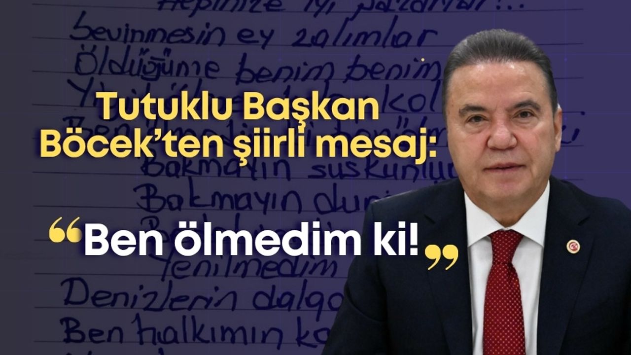 Antalya büyükşehir Belediye Başkanı Muhittin Böcek, cezaevinden paylaştığı şiirle Antalyalılara duygusal bir mesaj gönderdi. Selda Bağcan'ın "Denzilerin dalgasıyım" adlı şarkı sözlerini sosyal medya hesabından paylaşarak mücadele azmini ve inancını dile getiren Böcek, "Ben ölmedim ki" ifadesiyle umudunu yitirmediğini vurguladı.