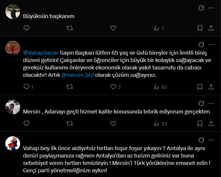 Sosyal medya hesaplarında yoğun etkileşim alan paylaşıma vatandaşlardan da yorum gecikmedi. "Büyüksün başkanım", "Mersin, Adana'yı geçti hizmet kalite konusunda tebrik ediyorum gerçekten" gibi destekleyici ifadelerin yanı sıra, toplu taşıma kullanımıyla ilgili çözüm önerileri de dile getirildi. Ancak paylaşımlar arasında Antalya ile Mersin'i turizm verileri üzerinden kıyaslayan bir yorum öne çıktı.