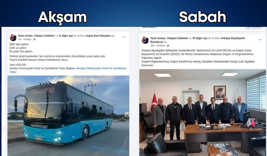 Yasin Arslan, sabah saatlerinde ise Antalya Büyükşehir Belediyesi Genel Sekreter Yardımcısı Cemil Böcek ve Ulaşım Daire Başkanı Nurettin Şengül ile bir araya geldi. Arslan, Antalya Büyükşehir Aralık ayı Meclis gündeminin konuşulduğu istişare toplantısının ardından “Ulaşım esnafına verilen destek” vurgusu yaptı. Bu paylaşım, görüşmenin içeriğine dair merakı artırdı. Arslan'ın zam istediği öğrenildi.